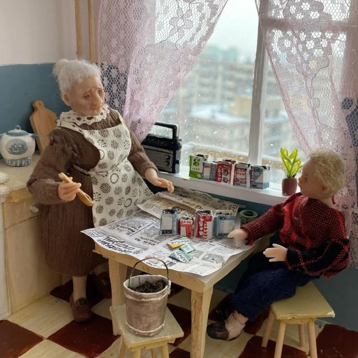 Главные герои зарисовок художницы – пенсионеры. Они живут своей жизнью, доказывая, что пенсия – это ещё не конец. Бабули и дедули едут на дачу за урожаем, поливают цветы, делают заготовки, чистят одежду, идут за грибами, вяжут, болтают, играют с внуками, наслаждаются неспешной беседой за чашкой чая и совместными воспоминаниями.Хрисанова делает как абстрактные домики, игрушки и композиции, так и воссоздаёт миниатюры по фотографиям, помогая людям окунуться в тёплые воспоминания и поностальгировать о светлых моментах жизни.