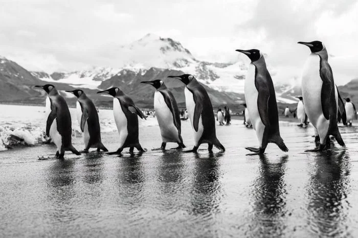 Этих королевских пингвинов фотограф заснял во время экспедиции в Антарктиду. Он долгое время наблюдал за колонией, их повадками и общением. Фото сделано на острове Южная Георгия, где обитает около 450 000 пар королевских пингвинов и примерно 30 колоний.
