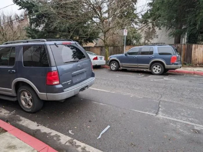 Одинаковые модели машин в одном цвете, обе припаркованы в неположенном месте и обе без номерных знаков.