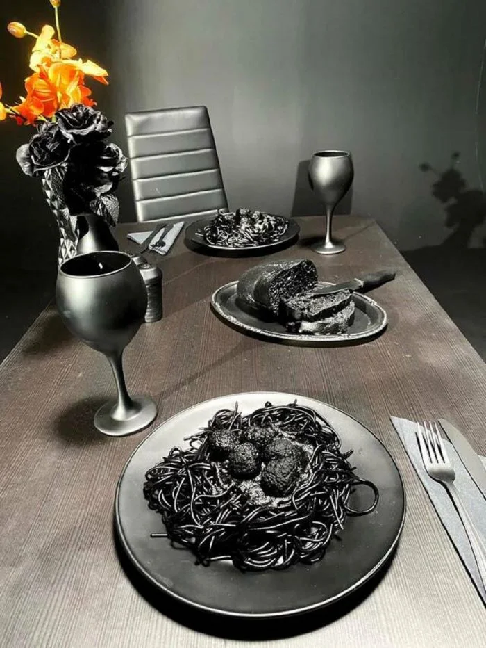 "Чёрные макароны и хлеб, которые мы приготовили с использованием пищевых красителей для музыкального клипа. По вкусу не отличаются от обычных."