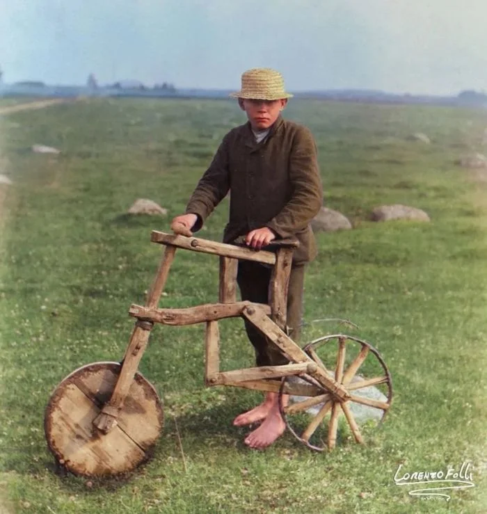 Эстонский мальчик и его собственный деревянный велосипед, 1912 год