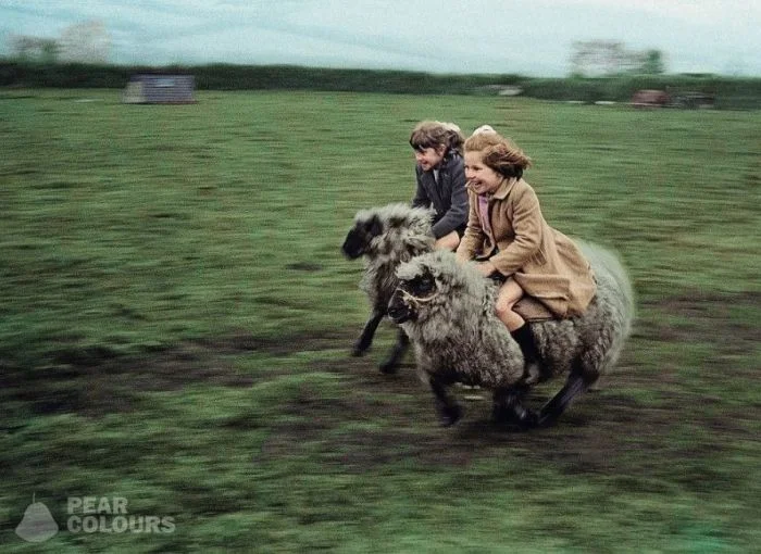 Две девочки катаются на овцах в Корнуолле (Великобритания), 1969 год.