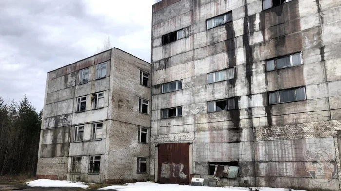 Время за разговорами шло быстро, и вот среди высоких деревьев вдруг становится заметно серое здание. Подойдя поближе, мы понимаем, что скорей всего оно давно заброшено. Выбитые стекла и общий удручающий вид строения не вызывали в этом сомнений.