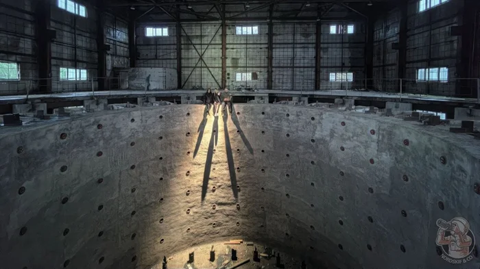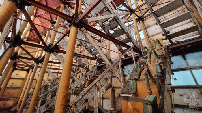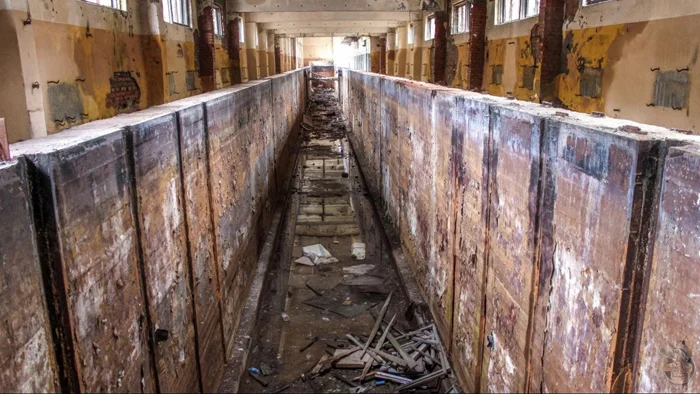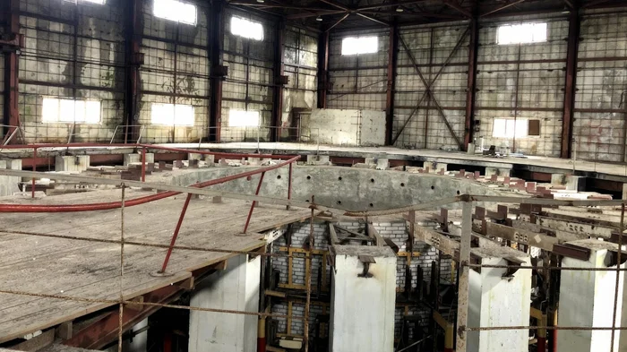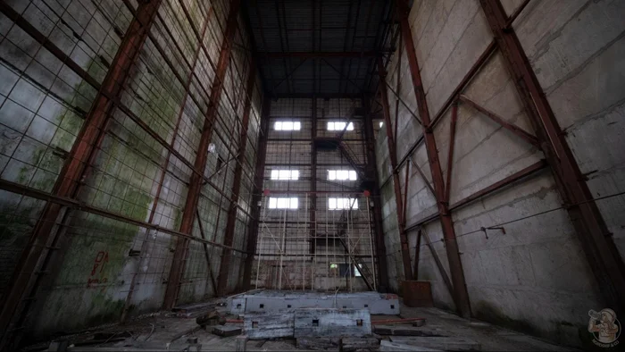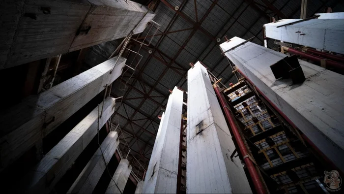 На входе в здание царили мрачные потемки. Первое помещение, где мы оказались, стояло абсолютно пустым, а все его стены были в металлических конструкциях. Чтобы понять предназначение места, этого было недостаточно. Из соседнего цеха доносились глухие звуки падающих капель, и именно туда мы идем дальше.