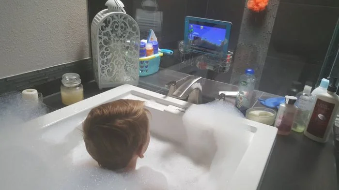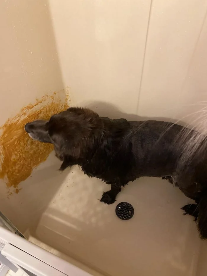 Мой брат применяет арахисовое масло, чтобы собака не двигалась во время купания.