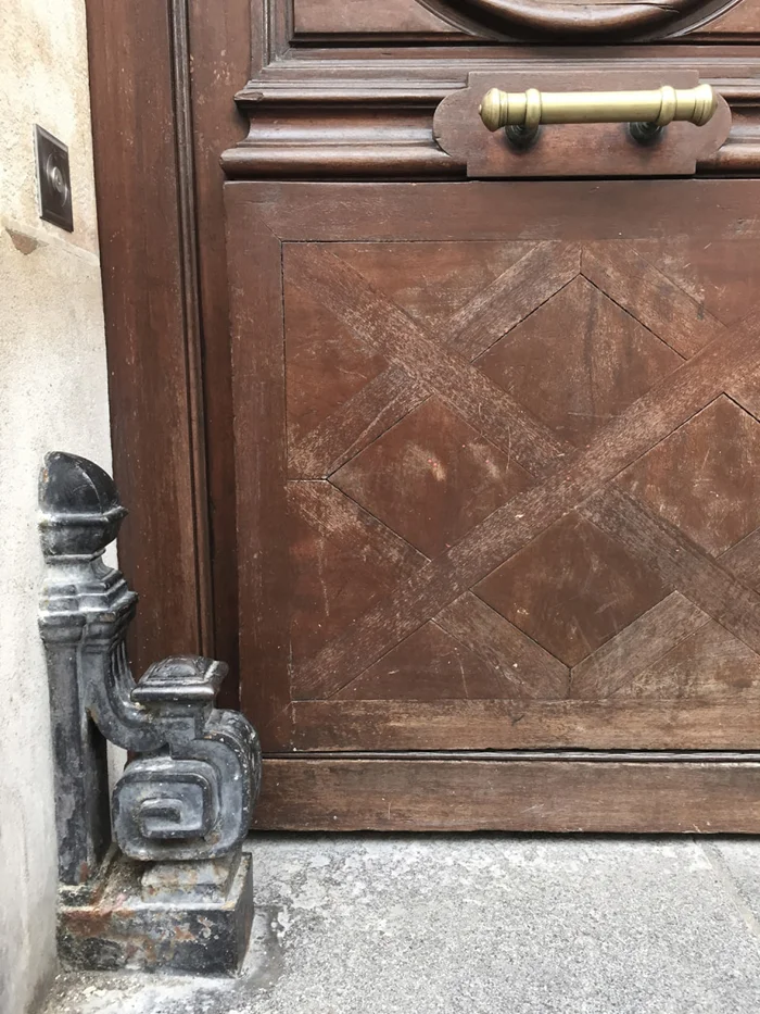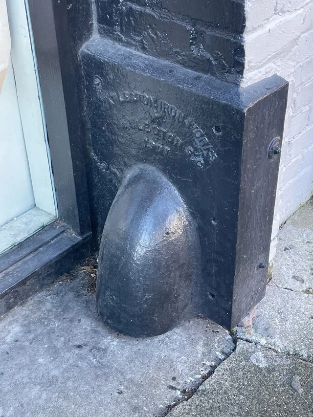 Это не труба. Это колесоотбойная тумба, чтобы повозки углы не портили. Сейчас, конечно, из ворот повозки не так часто ездят, но и тумбу сносить нет особого смысла. Вот тумба на углу: