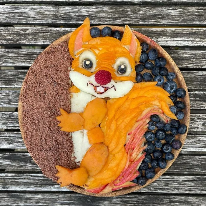 4. Используя свежие овощи, фрукты, сыр и другие продукты, Сара создаёт миниатюрные шедевры, изображающие различных животных, начиная от смешных пингвинов до милых кошачьих мордочек