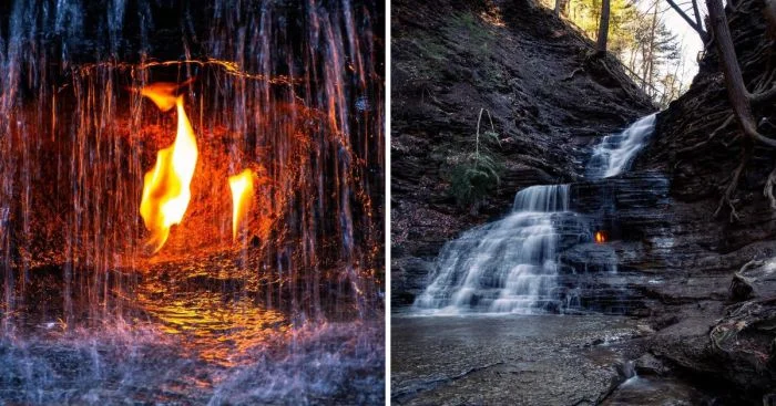 Это уникальное явление, соединяющее две стихии, можно увидеть в парке Честнат-Ридж в Нью-Йорке. Пламя не является делом рук человека, оно появилось в результате скопления природного газа, хотя и в нестандартных условиях. Им занимаются учёные Блумингтона и Национальный институт геофизики и вулканологии Италии.