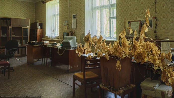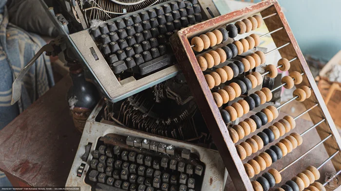 Счёты и пишущие машинки в кабинете в АБК заброшенного предприятия