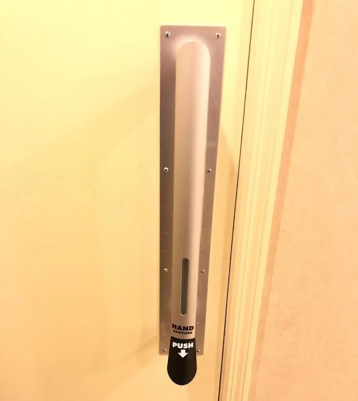 Дозатор антисептика на ручке туалетной комнаты.