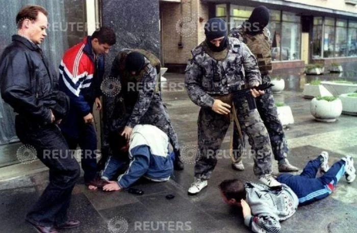34. Бандитский "патруль" на "охраняемой" территории. СПб, 1994 год. (Фото из архива МВД СПб).