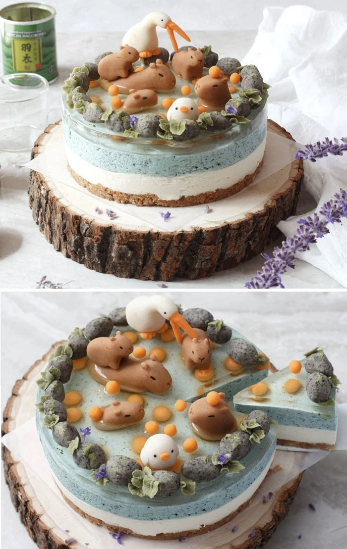 2. "Тортик с желатиновым озером. Я решила изобразить место, куда мы ходили рыбачить, когда я была маленькой. Делала его с такой радостью!"