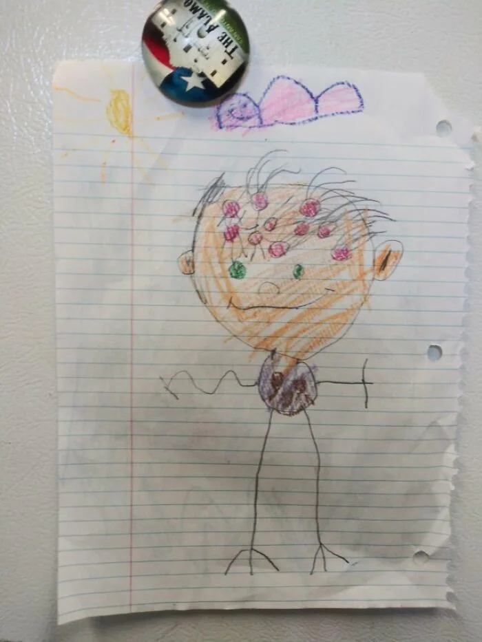 25. "Рисунок моей четырехлетней дочери. Красные кружочки - "дырки, из которых растут волосы".