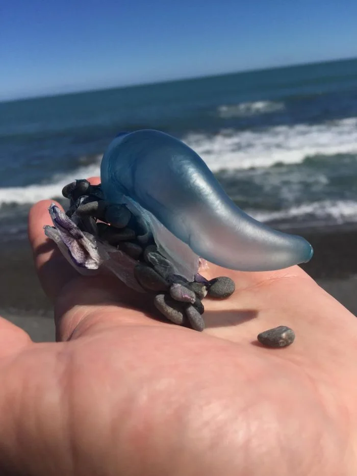 Это часть ядовитого португальского кораблика или физалии. Тело кораблика - это колония так называемых зооидов - отдельных организмов, которые развиваются и проводят всю жизнь вместе. Пузырь синеватого цвета с фиолетовым или розовым отливом, или, по-научному, пневматофор, удерживает всю колонию на поверхности воды.