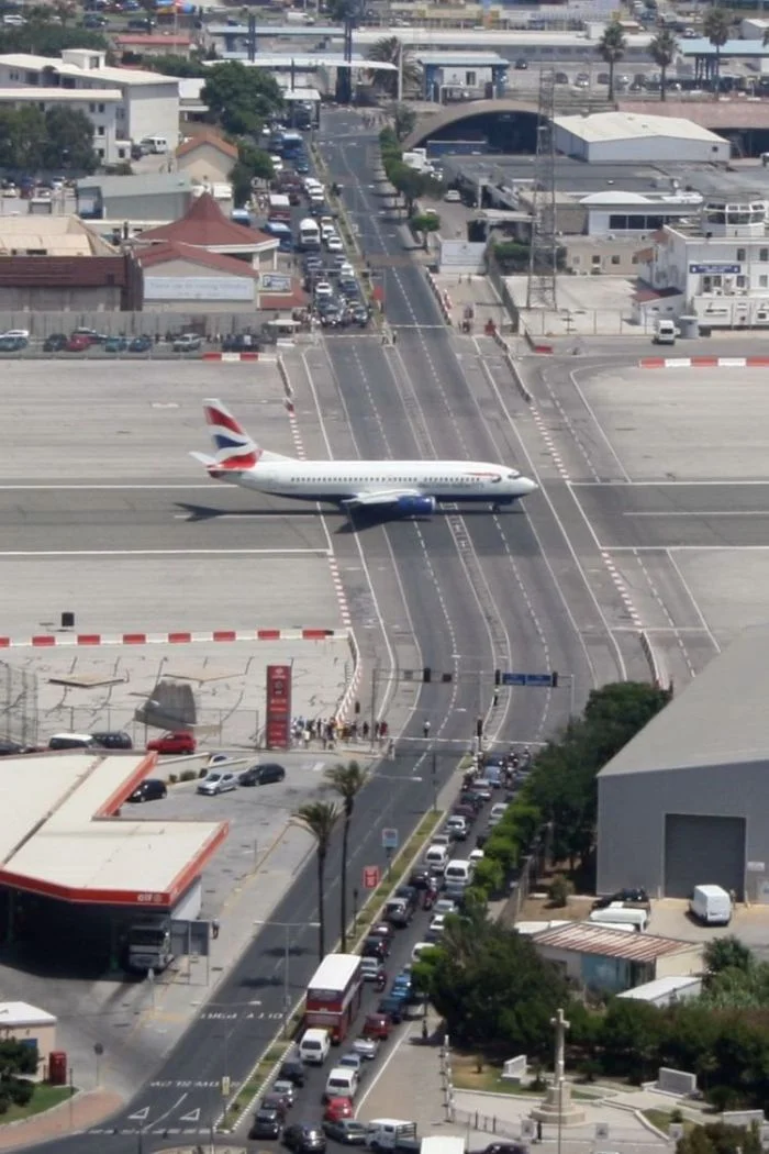 12. Взлетно-посадочная полоса в международном аэропорту Гибралтара, пересекающаяся с главной дорогой