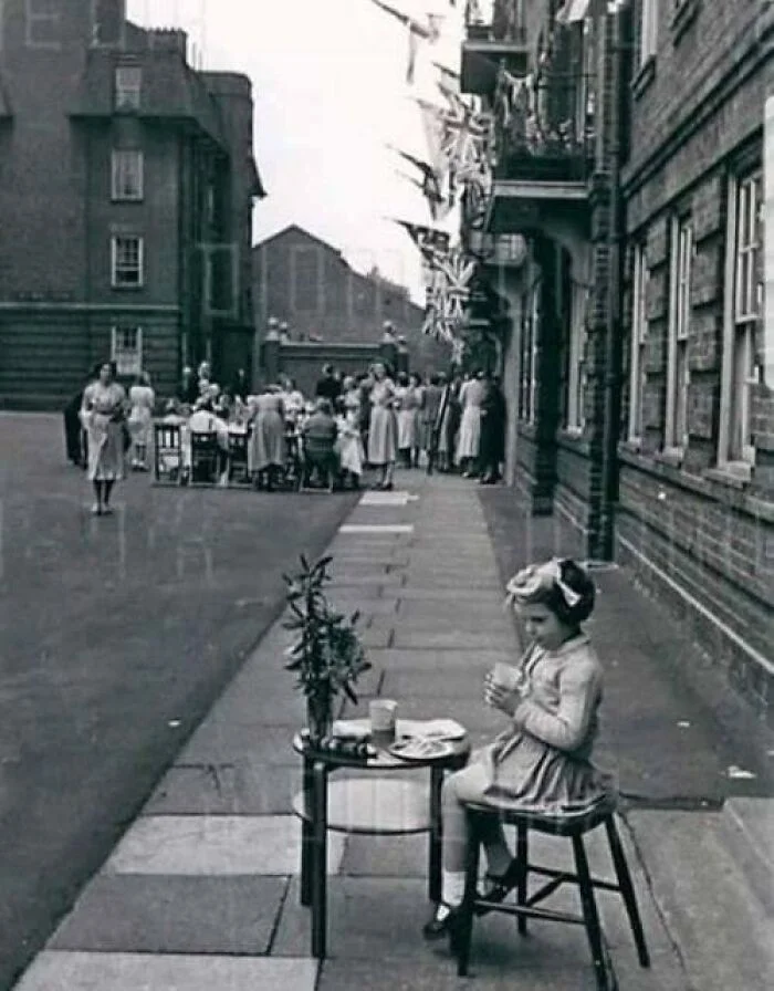 29. Социальная дистанция из 1953 года. Девочка, больная корью, сидит отдельно во время вечеринки в честь коронации в Челси, Англия