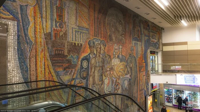 А между тем, здешние панно крайне интересны как по сюжету, так и по технике выполнения. Мозаики сложены из крупных кусков плитки, но при этом достаточно пластичны и детализированы за счёт неравномерной окраски элементов. Главный интерес представляет панно на тему космоса, но лишь потому, что относительно других сюжетов соцреализма тема космоса в советской мозаике встречается чуть реже, чем остальные.