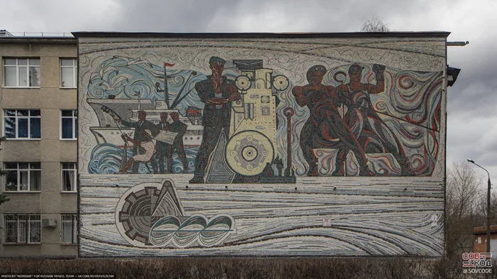 Оформление проспекта Кораблестроителей оказалось, создавали на судостроительном заводе Красное Сормово. Удивительная история, на территории предприятия-гиганта был собственный панельный цех где мозаичные панно изготавливали в заводских условиях по эскизам художника Юрия Приданова. Сюжеты панно утверждались на самом высоком уровне в столице, лично министром речного флота.
