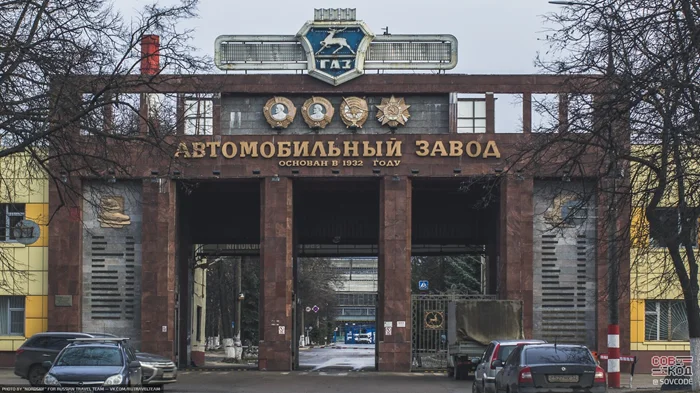 Не обошла «мода на мозаику» и центральное городское предприятие — автомобильный завод. Тут интересна как сама проходная, так и две бетонные плиты с мозаичными панно установленные по бокам аллеи напротив главной заводской приходной.