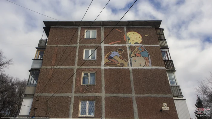 Мозаика собиралась сразу на заводе, но из-за экономии, художникам разрешили оформить всего несколько плит на каждый дом: вот такой «соцреализм-минимализм».