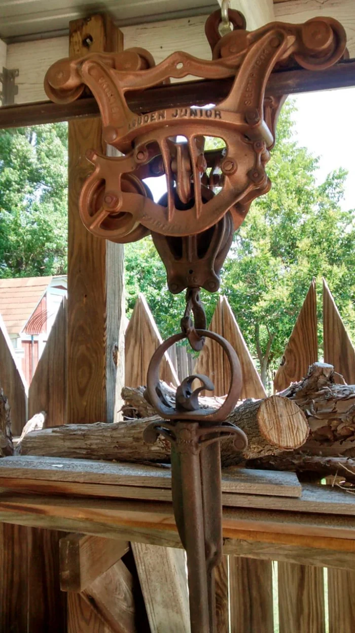 Это держатель(гарпун) для сена, которым удобно переносить большие объемы сена в амбаре. Он крепится при помощи веревки к специальной тележке, которая ездит вверху амбара на полозьях. Логика работы - проткнул сноп гарпуном, поднял, переместил куда надо.