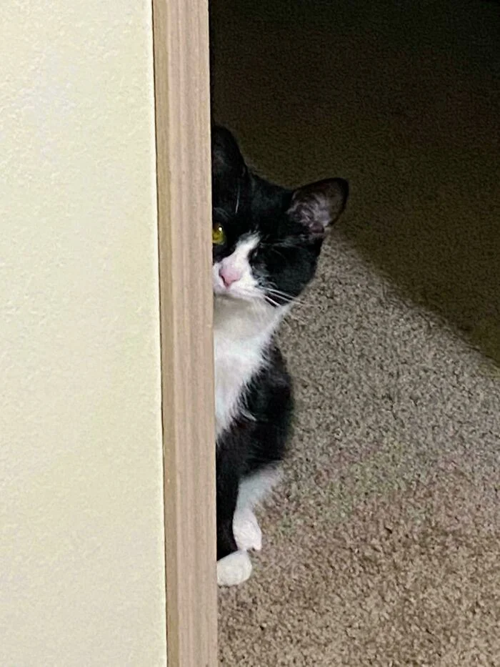 5. "У моего кота нет одного глаза. Вот как он "выглядывает" из-за стены"