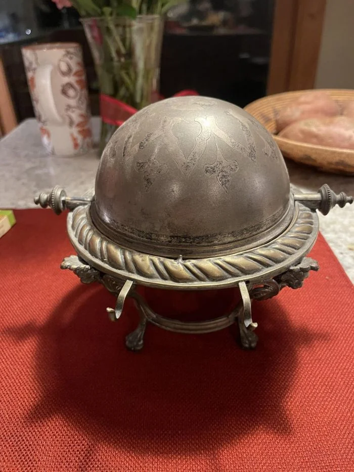Это посуда для сервирования масла или икры. Крючки спереди предназначены для фиксации ножа и ложки.