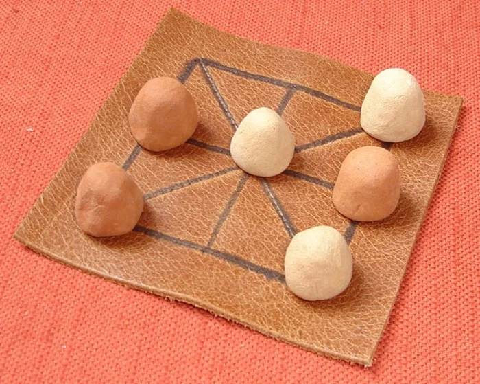 Это старинная игра "Три танцующих человека", прародитель игры три-в-ряд. Два игрока по очереди размещают фишки на доске с целью создать ряд из трех, одновременно мешая противнику. Когда все фишки находятся на доске, игроки по очереди перемещают фишки на соседнюю позицию снова с целью создать ряд из трех. Первый игрок, создавший ряд из трех, побеждает. У нас некоторые ее модификации (где 9 фишек) известны под названием "Мельница".