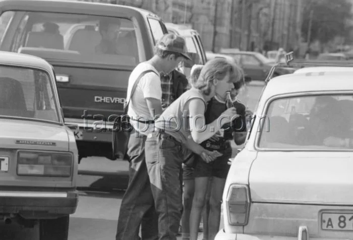 16. Дети продают напитки среди потоков машин у метро «Сухаревская» в Москве, 1992 год.