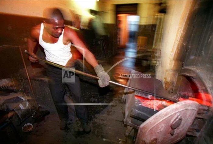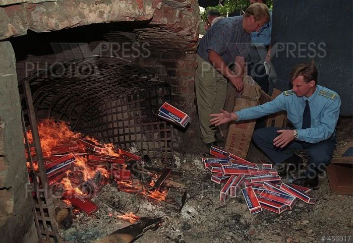 18. Офицер таможенной службы уничтожает партию контрабандных сигарет в печи московского завода, 17 июня 1996 года.