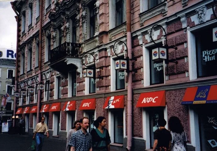 Одновременно с KFC, в том же здании, но этажом выше, открылось второе в Петербурге заведение Pizza Hut. До недавнего времени KFC и Pizza Hut входили в структуру компании PepsiCo, с октября 1997 года ресторанный бизнес был выделен в компанию Tricon. (Д.Г.)