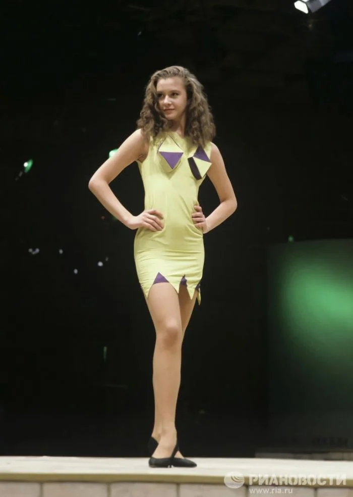 38. Манекенщица демонстрирует платье из коллекции модельера Алексея Грекова, 1992 г.