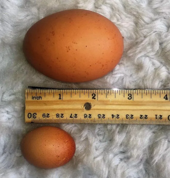 14. Яйцо вверху было снесено старой курицей, а яйцо внизу - молодой, которая только начала откладывать яйца