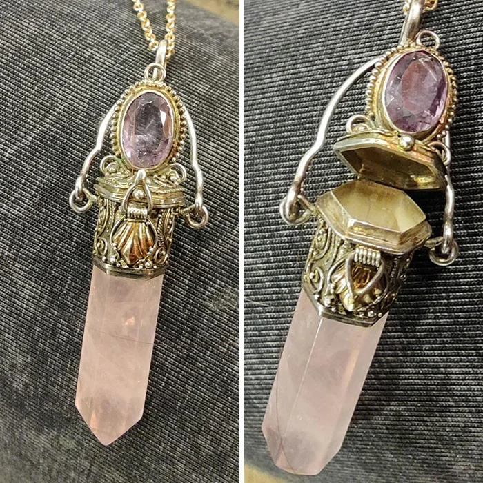 24. "Этот чудесный винтажный кулон достался мне от бабушки. Розовый кварц и аметист. В нем даже есть потайное отделение"