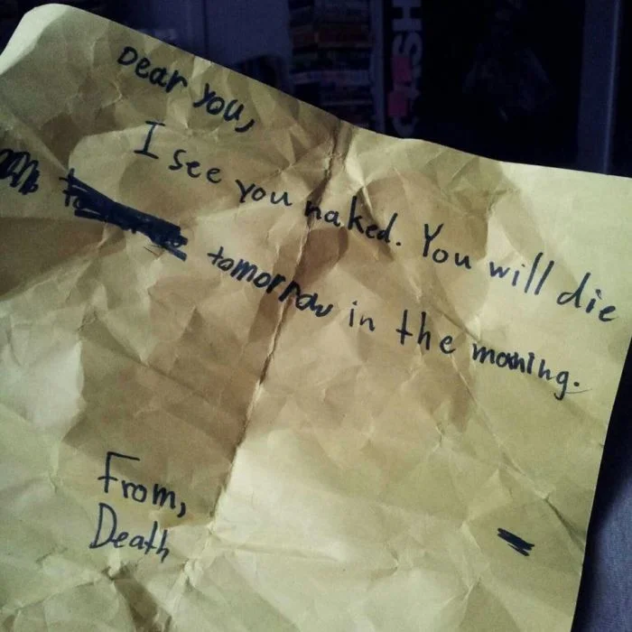 15. "Дорогая, я вижу тебя обнаженной. Ты умрёшь завтра утром. Смерть"