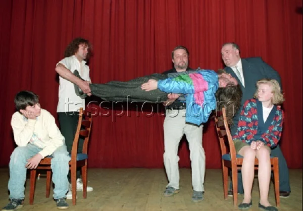 Международный семинар народных целителей. На снимке: сотрудники Московского медицинского центра «Имаго» под руководством Валерия Авдеева (крайний справа) демонстрируют человека в каталепсии. Москва, 1994 год.