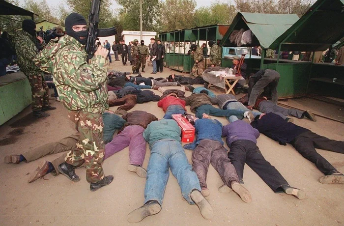 Сотрудники СОБРа задержали группу подозреваемых во время рейда на рынке под Москвой. 1995 год.
