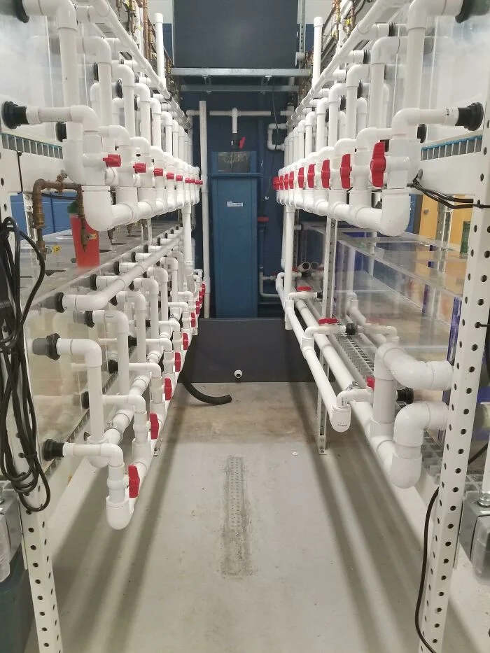 13. "Аквариумная комната, в которой я проводил трубы. 31 резервуар с индивидуальной подачей воздуха, рециркуляцией воды, переливом и сливом"