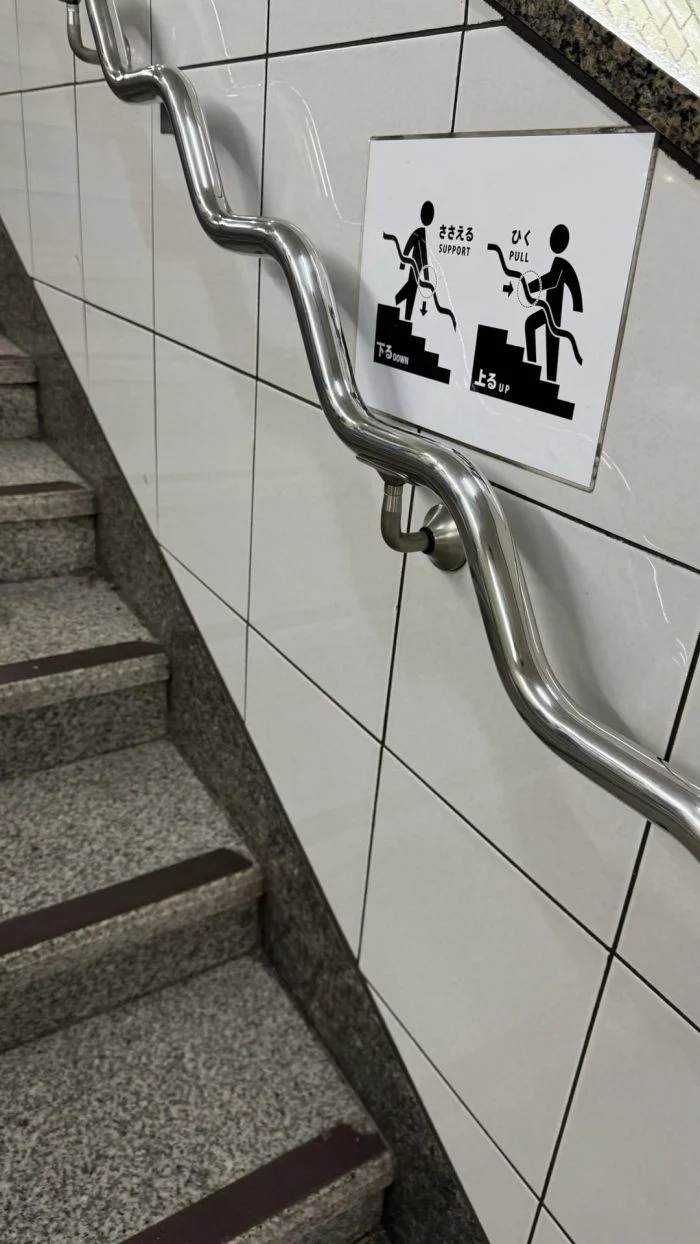 Такие поручни часто можно встретить в Японии. Они предназначены для пожилых людей, так как помогают лучше удерживать вес при подъёме и спуске по лестнице.