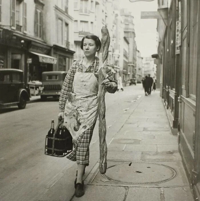 26. Француженка с багетом и шестью бутылками вина на улицах Парижа, 1945 год