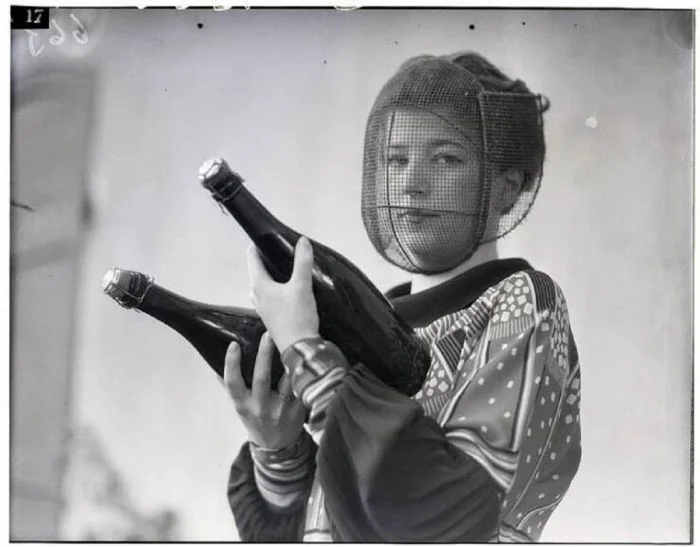 11. Девушка проводит контроль качества шампанского в стальной защитной маске