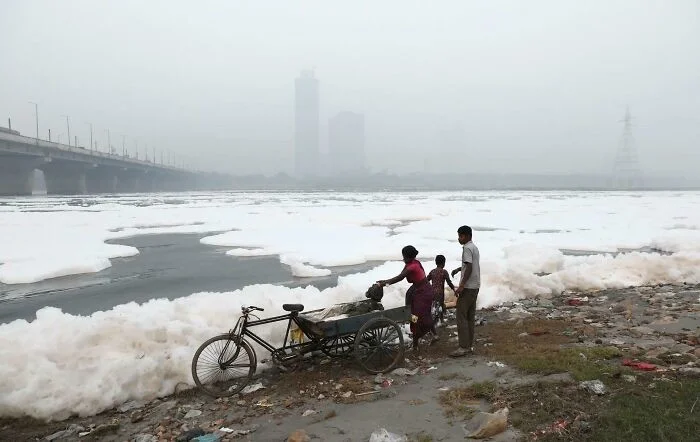 7. Смог на реке в Нью-Дели — нет, это не лед на воде, а пена из ядовитых химикатов