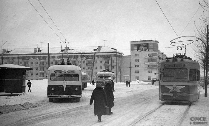 15. Омск. Угол пр. Мира и ул. Нефтезаводской. Остановка транспорта - Советский исполком, 1960-е годы.