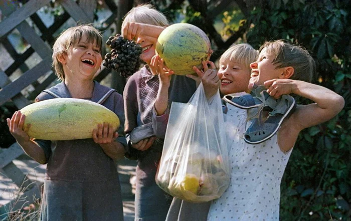 Воспитанники Ташкентского детского дома держат в руках дыню, арбуз, виноград и персики, которые они сами вырастили на своем приусадебном участке. Ташкент, 1983 год.