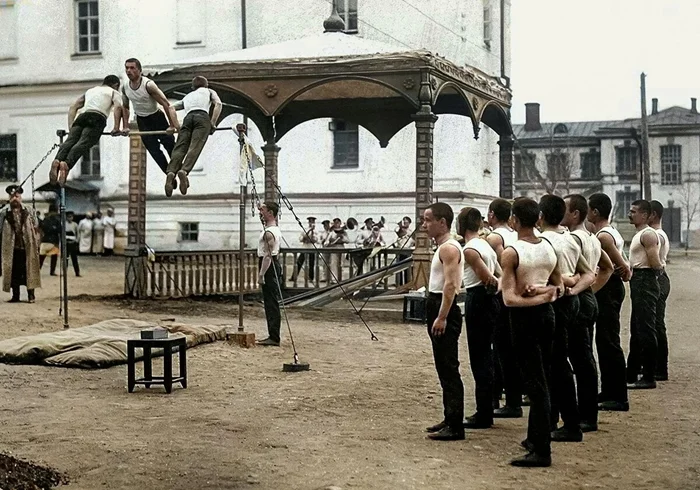 Спортивные занятия во дворе Кадетского корпуса. Наблюдает генерал-лейтенант Медведев Александр Ардалионович.