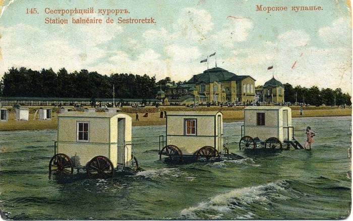 В 19 веке оборудованные купальни приняли свой канонический вид. Из Европы в Россию пришла мода на «купальные фургоны» (в Европе они появились примерно в середине 18 века). На берегу в фургон заходил человек, переодевался, а затем лошадь везла фургон в воду подальше от берега. Когда человек хотел вернуться на берег, нужно было поднять флажок.