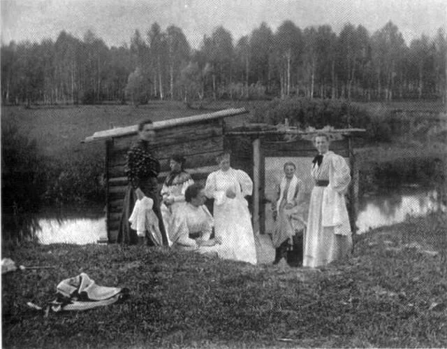 Софья Андреевна (Толстая) с дочерьми и знакомыми около купальни на реке Воронке. Ясная Поляна, 1896 г