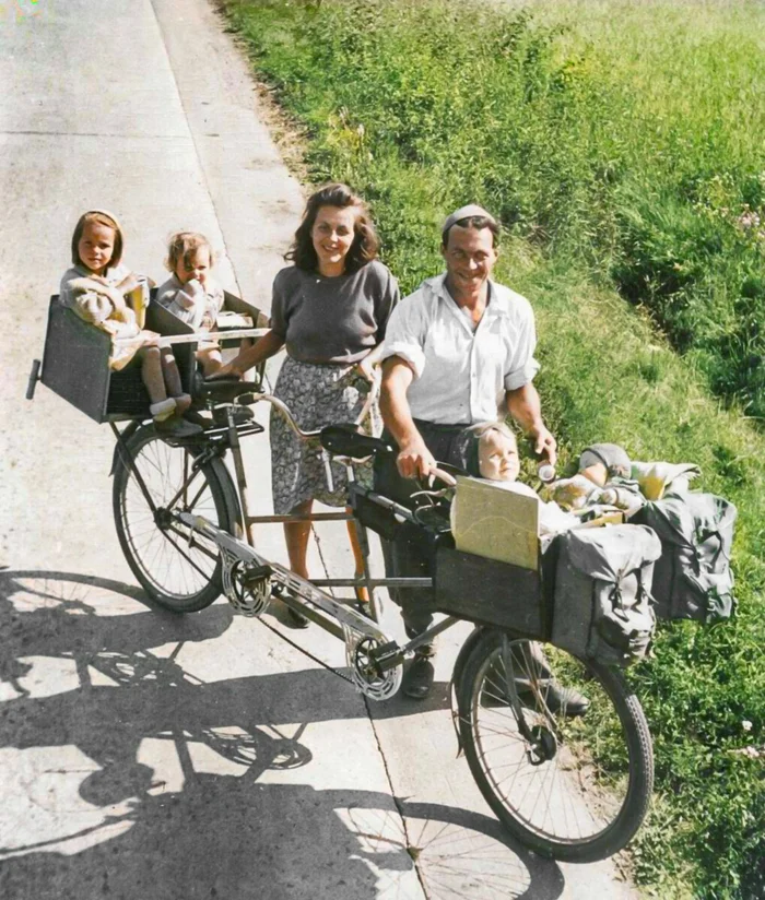 Шведский фермер с женой везут семью на велосипеде тандем, 1949 год.