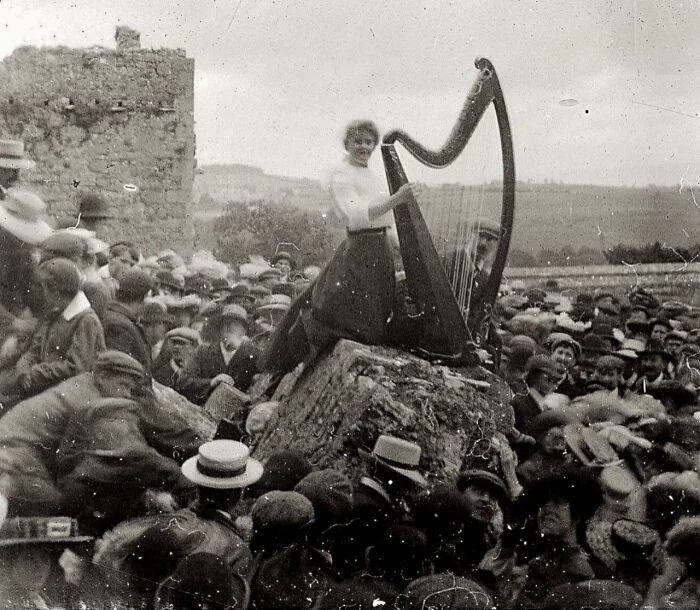 18. Молодая женщина играет на арфе перед большой толпой, Кашельская скала, Ирландия, ок. 1910 г.