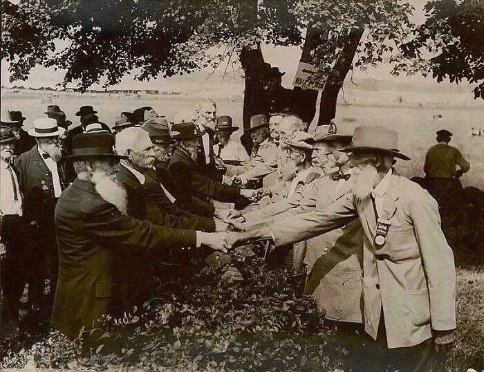 23. Ветераны Союза (слева) и Конфедерации (справа) встречаются в честь 50-й годовщины битвы при Геттисберге в 1913 году